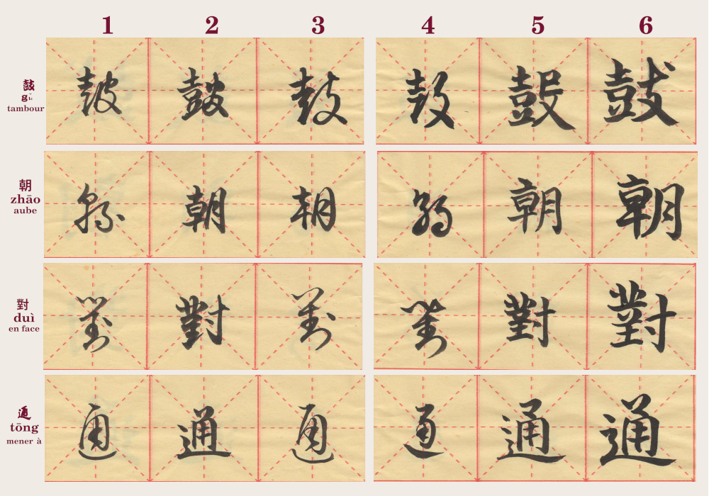 Exercices préparatoires : quatre caractères calligraphiés à partir des modèles de cinq grands calligraphes (extraits du texte « 1000 caractères »)