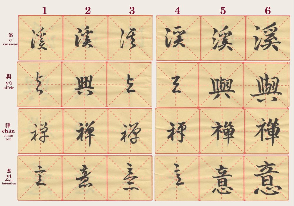 Exercices préparatoires : quatre caractères calligraphiés à partir des modèles de cinq grands calligraphes (extraits du texte « 1000 caractères »)