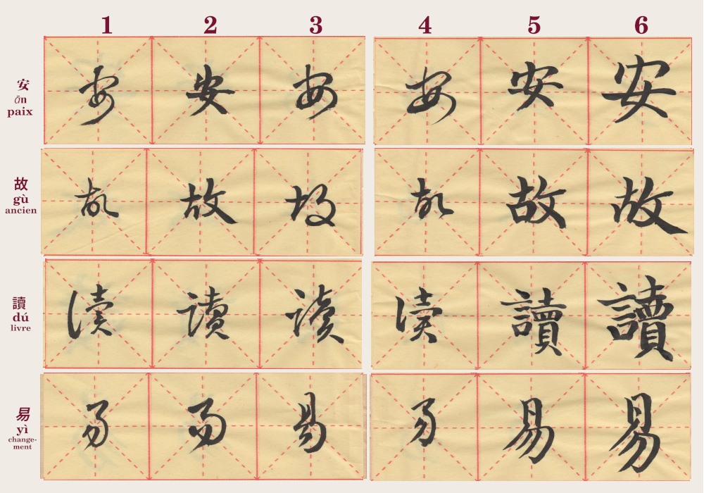 Lorsque, fascinée par la peinture chinoise, j’ai souhaité apprendre la technique, Shi Bo m’a dit qu’il fallait d’abord comprendre le maniement du pinceau en passant par des exercices répétés de la calligraphie.
